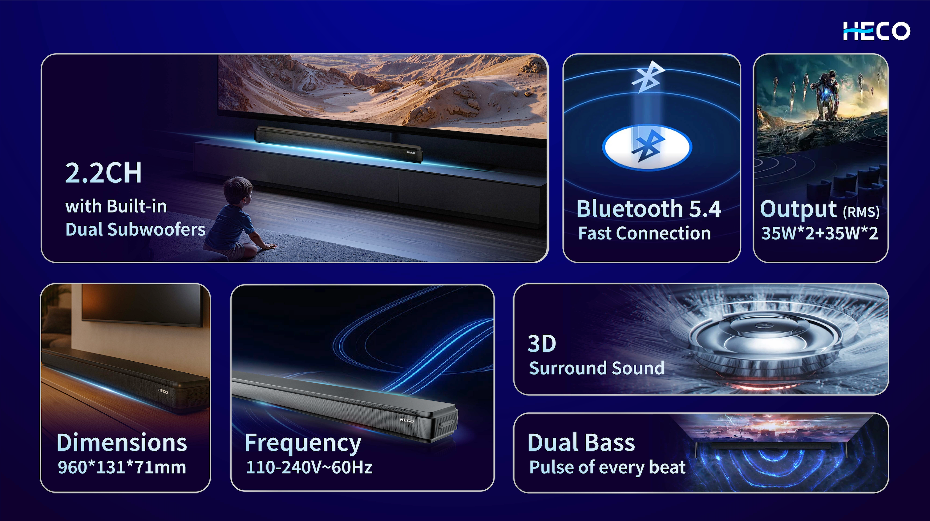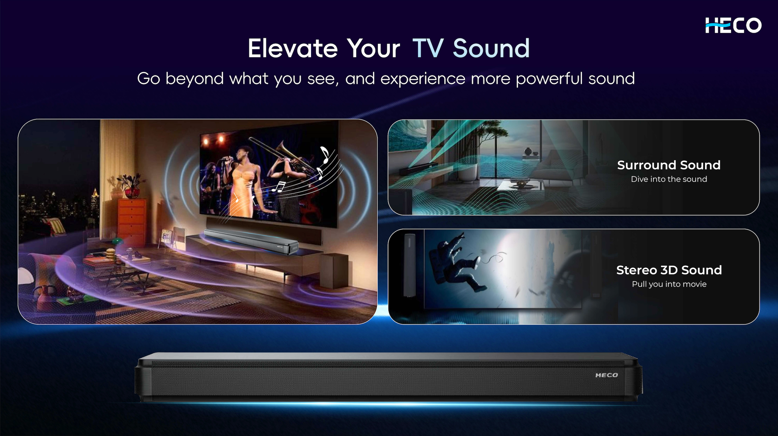 Heco Soundbar Pulse, Remote control, AC Power cable, 3.5mm to RCA cable, User manual, Wall-mounted kits